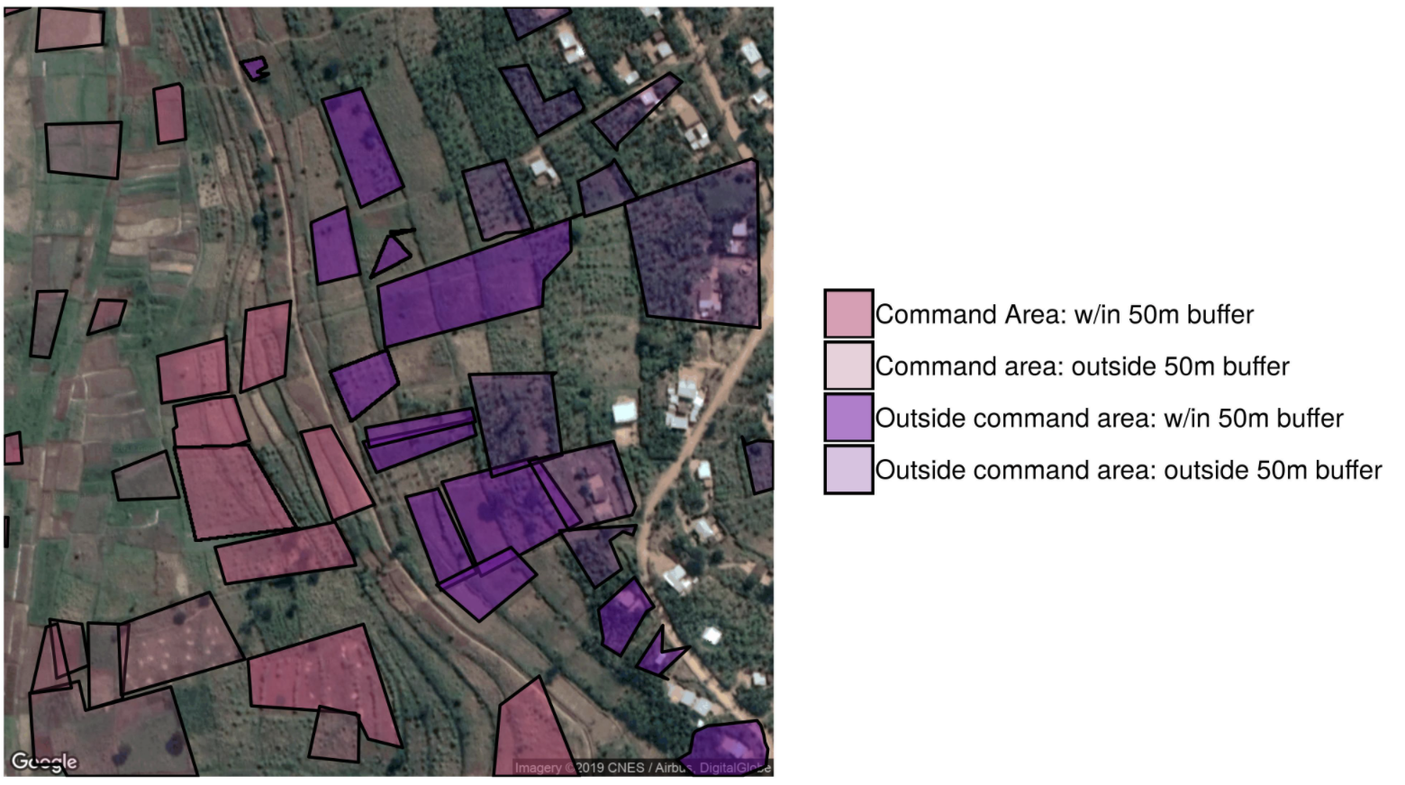 上述两个例子都显示了空间断点回归设计。湖南湖北的断点是通过洞庭湖分割,在湖南湖北越靠近省界的区域,湖南话湖北话存在差异,我们可以假设人均收入差异都是由于湖南话和湖北话导致的。而图9.8中,水渠的断点是由于坡度区分了两块:粉色区域和紫色区域。粉色区域高度低于水渠,所以可以得到灌溉,而紫色区域由于在水渠上方,所以不能获得灌溉。实践中,我们关注于水渠两侧较近的距离内(例如,50米以内的灌溉区域)。越接近的灌溉区,其唯一的差异就是是否可以获得灌溉水,因此,我们可以假设农业产出的任何差异都只是由于是否获得灌溉导致的。这就是空间断点回归。