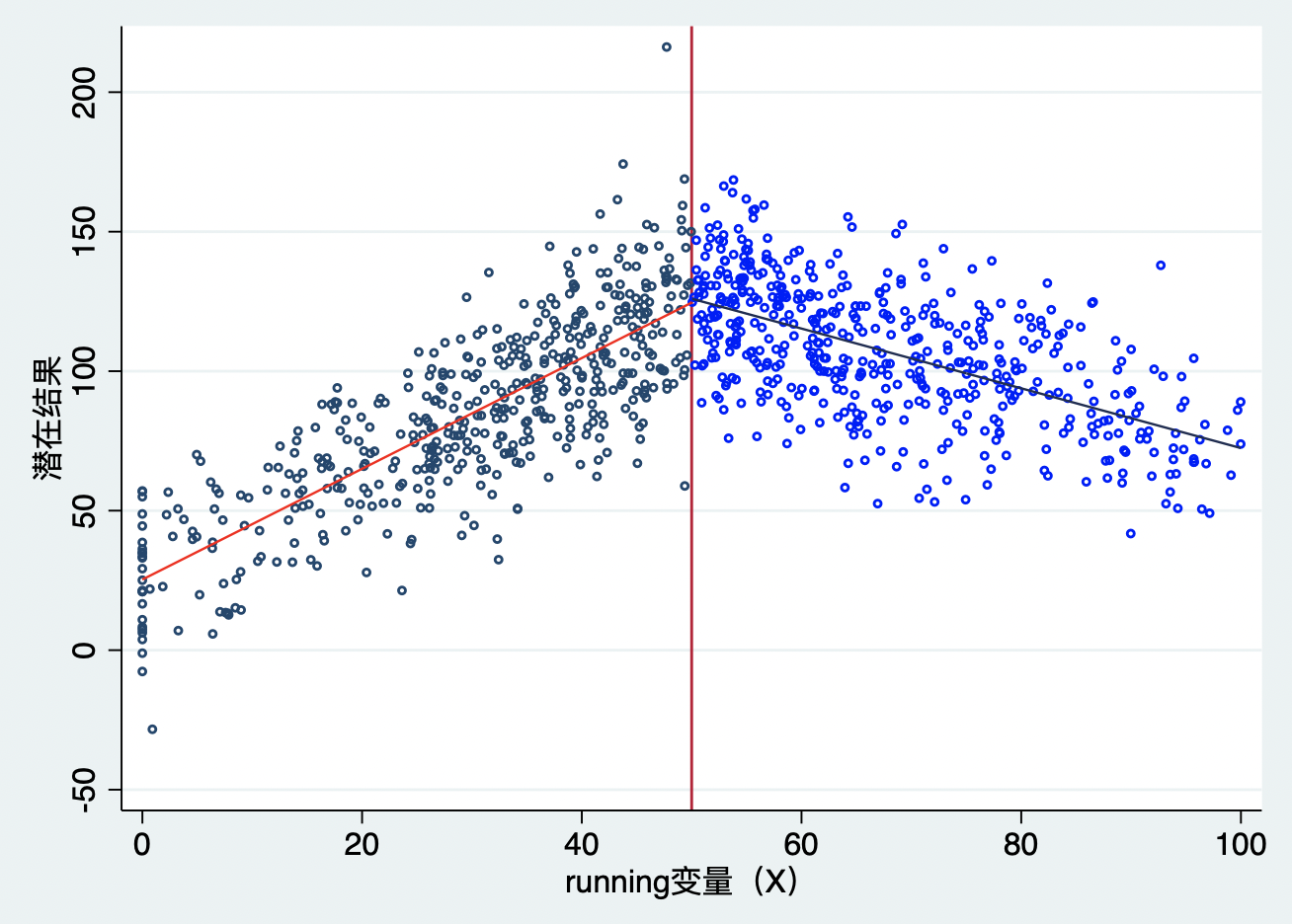 想象一下,在断点附近,结果变量并没有显著的差异,也就是,断点附近的结果变量观测值仍然连接在一起,但是我们可以明显观察到断点两边的斜率发生了变化,如图10.6所示。断点处的处理并没有使得结果变量本身发生”跳跃“,而是改变了结果变量和running变量X之前的关系强度,即斜率发生了变化。