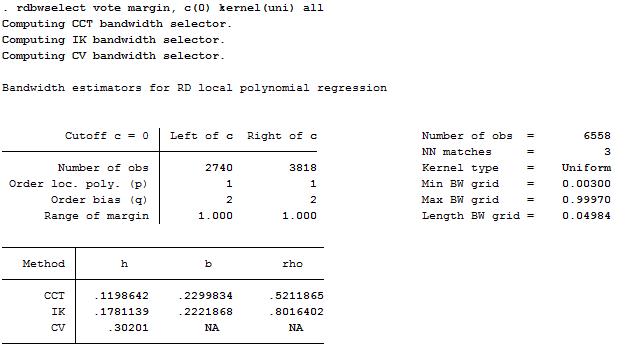 rdbwselect vote margin, c(0) kernel(uni) all(选择最优带宽)