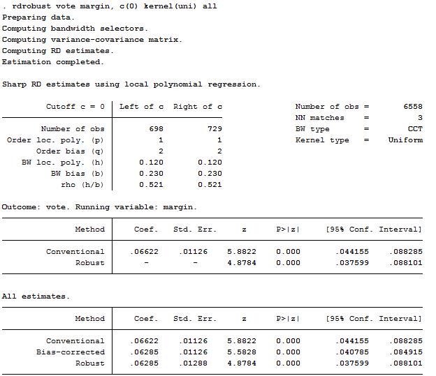 rdrobust vote margin, c(0) kernel(uni) all(估计断点回归估计量)