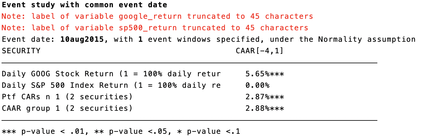 我们并没有声明估计窗口,因此,estudy命令默认的估计窗口是从样本期内的第一个交易数据开始到事件日期前30个交易日为止。上述结果给出了事件日期,声明的事件窗口数和实施的诊断检验。表格的第一列是变量的标签信息,第二列是计算得到的异常收益率,上例的结果计算的是累积平均异常收益率(CAAR),并且还标注了统计显著性,例如,google更名事件导致了谷歌股票收益率在事件窗口期提高了5.65%,且在1%的置信水平下显著。而谷歌更名事件对于整个标普500指数的收益率则没有显著的影响。此外,在多个股票收益率的情形下,estudy会在结果的最后两行给出资产组合方法和组群异常收益率的结果,它们对于评价事件的平均影响很有帮助。