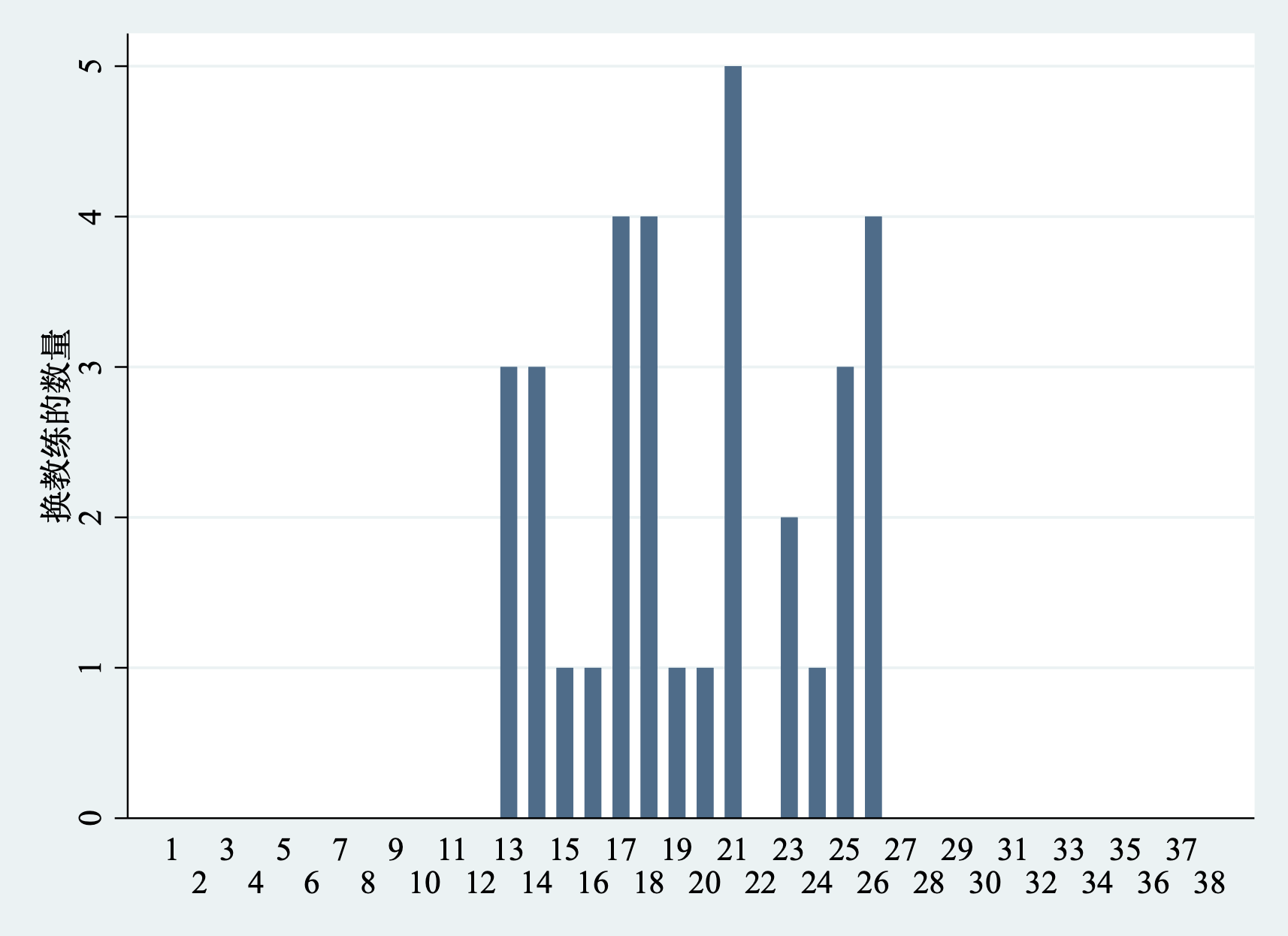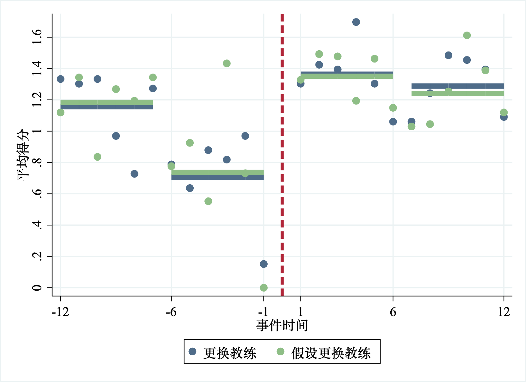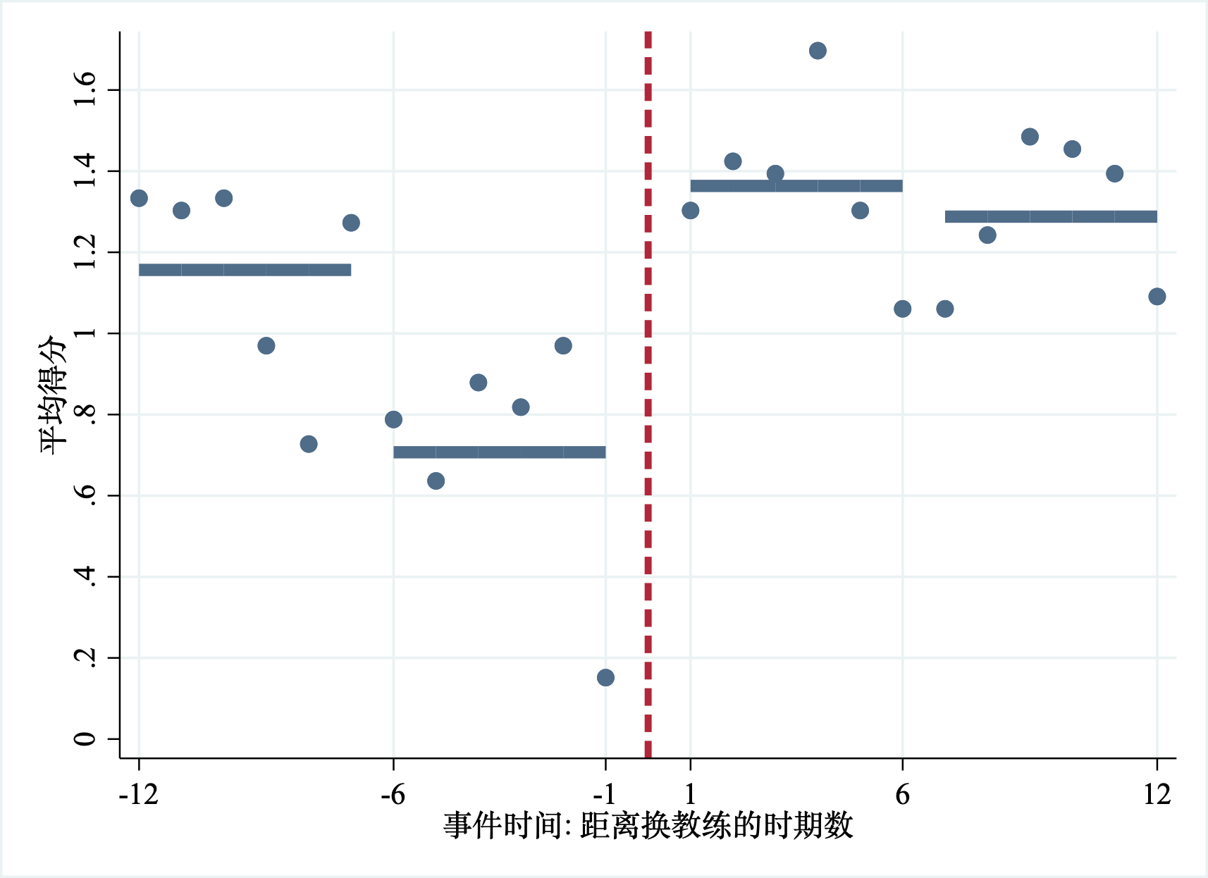 创建一个二值变量来表示在赛季中换教练。样本数据中有94次换教练的事件。为了分析球队成绩在干预前的变化和干预后的变化,需要让新教练有足够的场次来证明其能力。因此,样本数据选择了换教练前后各12场比赛。因此,选取的换教练事件仅仅发生在第13场-26场比赛之间。最后,94个换教练的事件中剩余33次,这33次换教练就是样本中定义的二值型处理变量。下面我们来看相关数据图。stata代码如下: