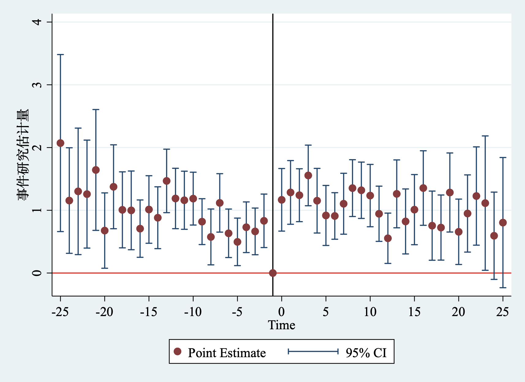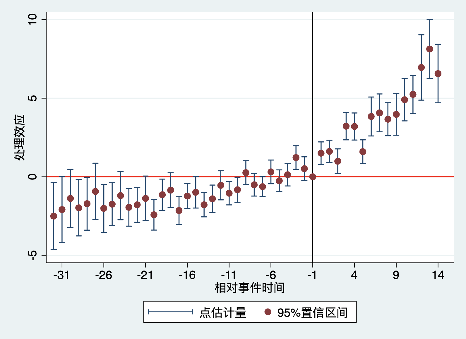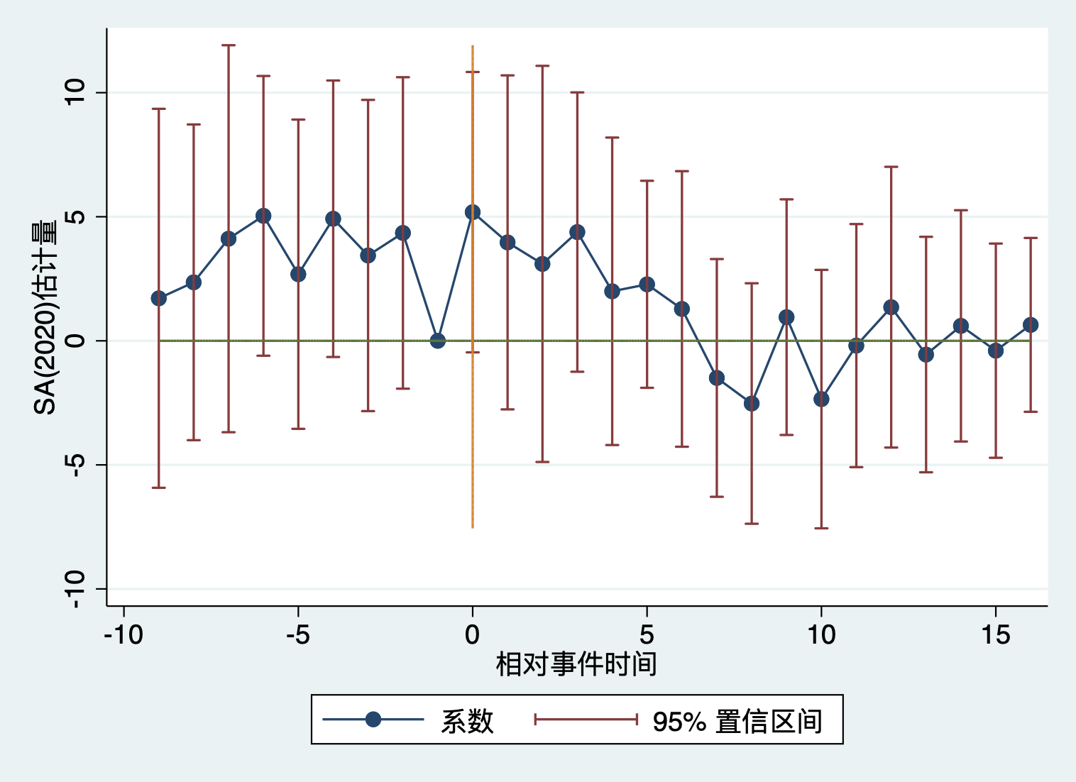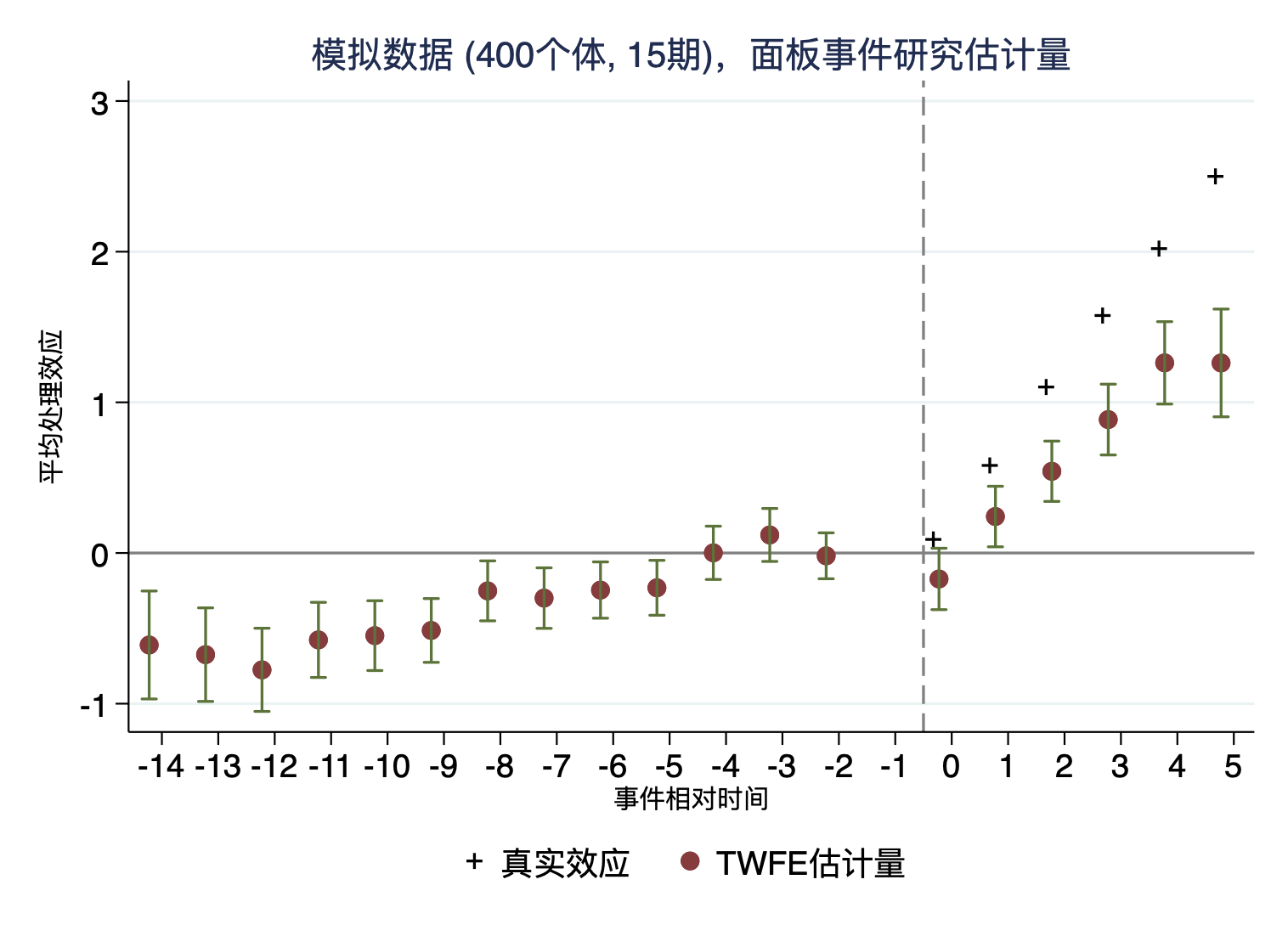 fect Y, treat(D) unit(id) time(time) cov(X1 X2) method("mc") lambda(0.004) se nboots(100) xlabel("相对事件时间") ylabel("平均处理效应") title("TWFE估计量和bootstrap标准误")