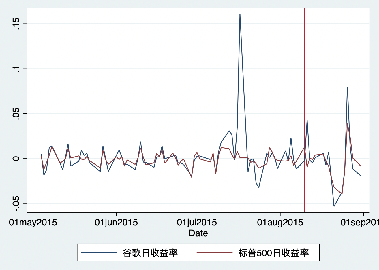 legend(order(1 "谷歌日收益率" 2 "标普500日收益率"))