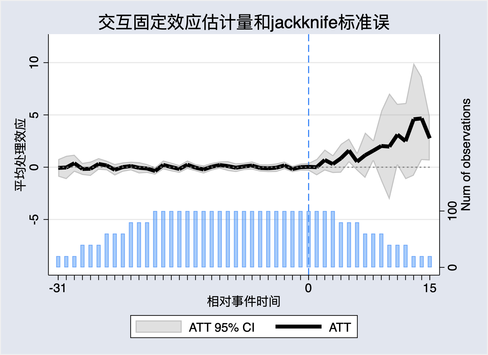 fect Y, treat(D) unit(id) time(time) cov(X1 X2) method("ife") force("two-way") se vartype(jackknife) xlabel("相对事件时间") ylabel("平均处理效应") title("TWFE估计量和jackknife标准误")
