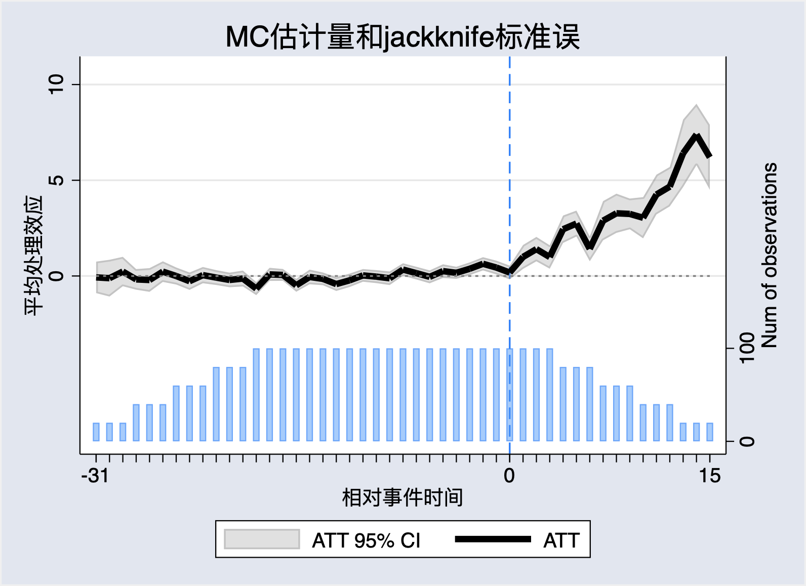 fect Y, treat(D) unit(id) time(time) cov(X1 X2) method("mc") lambda(0.004) se vartype(jackknife) xlabel("相对事件时间") ylabel("平均处理效应") title("TWFE估计量和jackknife标准误")