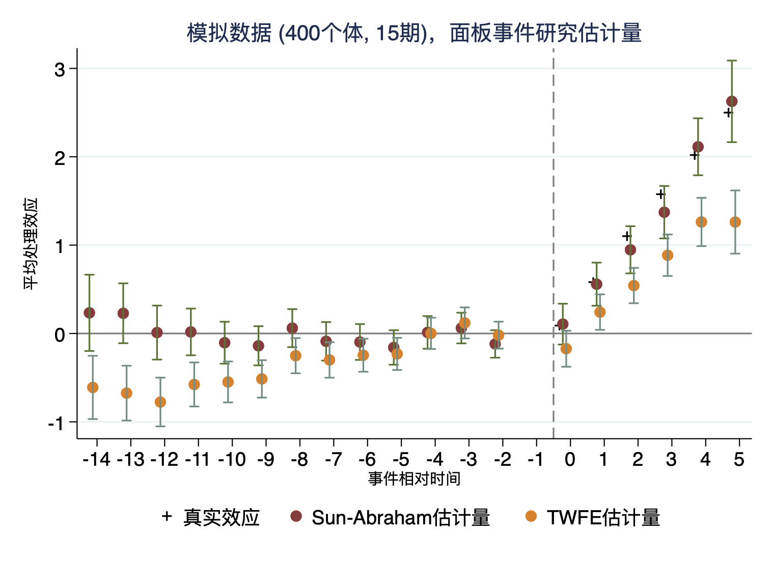 在这个例子中,\(\alpha\)显示了趋势:超过处理前1期和处理后三期的所有事件时间的结果平均变化。\(\beta_0\)显示了企业获得环境认证那一年的污染排放量变化;\(\beta_1\)表示认证后一年的平均变化,\(\beta_2\)表示认证后两年的平均变化,而\(\gamma_{-1}\)表示认证前一年的污染排放变化。注意:这些平均变化均剔除了平均变化趋势\(\alpha\)。其实,从回归的角度来说,我们用日历事件来声明回归方程也可以得到相同的结果。那两者的区别是什么?什么时候使用?为什么还要用事件研究呢?第一,事件研究中的相对事件时间更加的直观,即-1表示的处理前一期,1表示处理后一期等等。如果使用日历事件,在交叠处理情形下,处理前后就无法明确地区分。第二,虽然事件时间对于那些从未接受处理的个体来说并不好定义,但是为从未处理的个体定义事件时间可以让我们明确的考察“好的”控制组。第三,事件研究的事件时间转换有时候很麻烦,例如,包含一些与日历时间相关的变量——总趋势的时间虚拟变量。