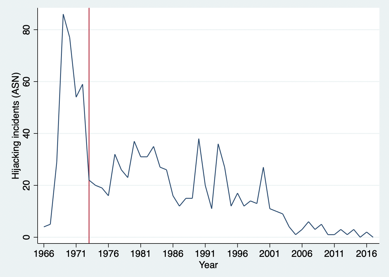 下面,我们从一个时间序列的例子来介绍时间序列方法。今年是美国911飞机劫持事件20周年。飞机劫持事件会造成非常严重的后果,例如,财产损失,人命关天等等。实际上,飞机劫持事件非常多,从Our World in Data上的统计可以看出,在飞机出现的时候,就伴随着飞机劫持等恐怖事件出现了。为了应对飞机劫持事件,美国在1973年引入了金属探测器,随后全球开始采用这一措施来降低飞机劫持事件。我们从Our World in Data网址下载全球20世纪初-2017年的飞机劫持事件数据,20世纪60年代以来的飞机劫持事件数据如图11.4所示。从图中可以看到,1973年后,飞机劫持事件的确大幅下降了。那么,我们感兴趣的问题就来了:安装金属探测器的安检措施对飞机劫持事件的效应有多大呢?这个时候,我们可以会用上述股票收益率的办法来估计安检措施的效应。