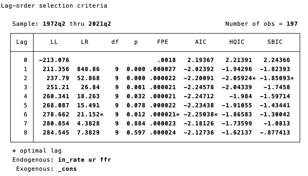 varsoc in_rate ur ffr,maxlag(8)