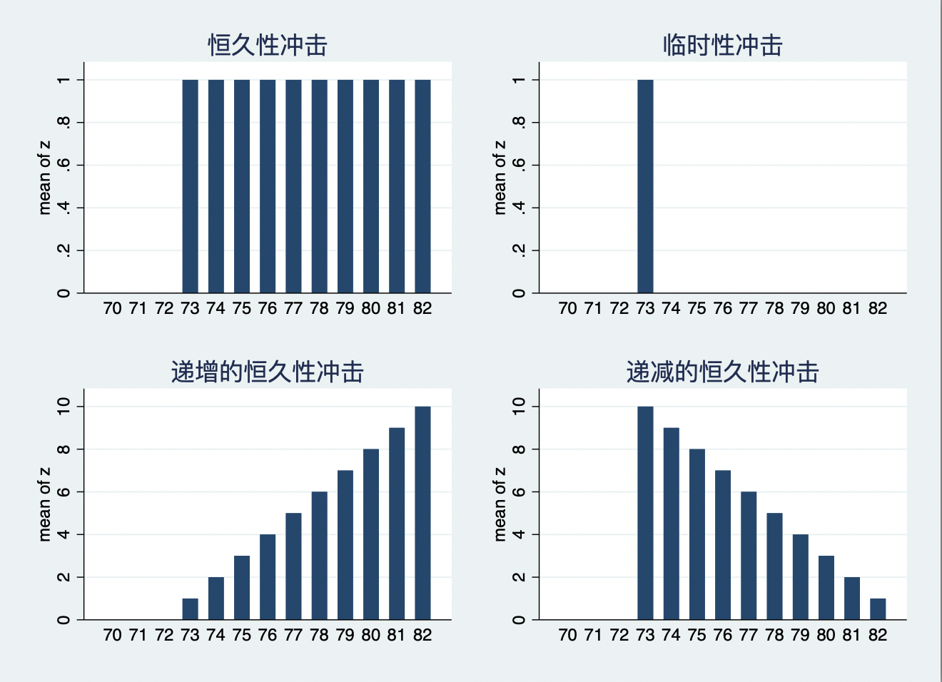 需要特别注意的是,现实世界中的政策干预/冲击不仅仅只有图11.5左上角那种“恒久性冲击”——1973年安装了金属探测器,以后每一年都有,或者1973年后政策干预变量从0变为1。除此之外,还有三种冲击类型:(1)如图11.5右上角的“临时性冲击”,政策变量只在1973年从0变为1,其它年份仍然为0,此时,由于自回归的性质,临时性冲击的效应也可能持续很多期;(2)如图11.5下方的“逐渐变化的冲击”,也可能逐渐递增,也可能逐渐递减。