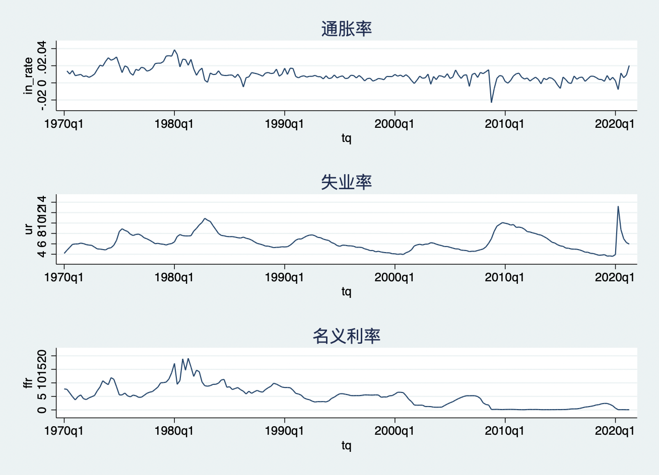 在利用向量自回归模型之前,我们肯定要收集数据,也就是在VAR模型中包含哪些宏观经济变量。变量选择要依据我们研究的问题和相关的理论来给出指导。此外,我们还要选择滞后期。此时,我们可以尝试一期一期滞后的加进VAR模型中,或者使用stata中提供的一些正式的滞后期选择标准来进行决策。下面,我们用美国1970年一季度-2021年一季度的宏观经济变量——失业率(ur)、通胀率(inflation)和名义利率(ffr)——来说明VAR的应用。我们可以将这个三变量的VAR模型写成: